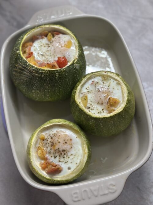 Quelle agréable surprise lorsqu’une patiente m’apporte un panier surprise de légumes du jardin ! De quoi se régaler ! Alors pour savourer ces belles courgettes rondes je les ai préparées farcies avec de l’œuf, de l’ail, des dés de jambon et de la tomate; une belle association. Ingrédients pour 4 personnes : Passez les courgettes …